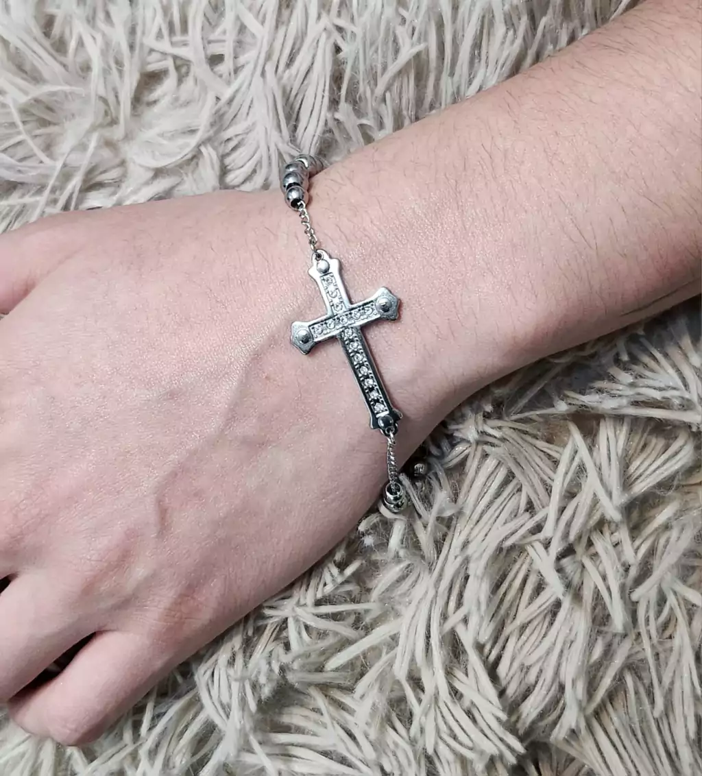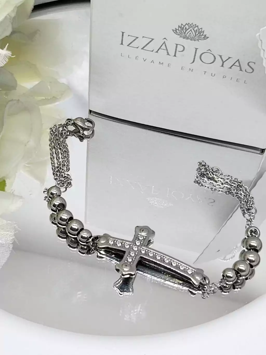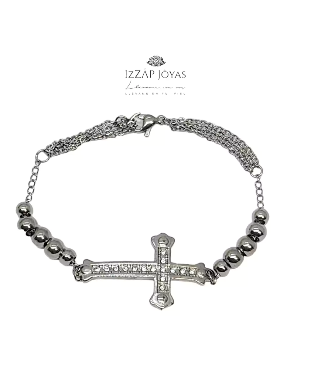 PULSERA CADENA CON CRUZ BRILLOS CENTRAL- ACERO QUIRURGICO